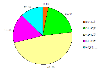 我校现有教职工2000余人,平时600余名教职工常年参加各种社团活动,约占总教职工人数的30%。表1-1和图1-1显示,在社团成员中,教师占31.2%,教辅人员占9.2%,管理人员占39.8%,其他职工占19%;男教职工占83.4%,远大于女教职工16.6%;41-50岁的教职工占48.2%,20-30岁的教职工比例最小仅3%。从以上统计数据可以看出,我校教职工文体社团日益成为在校园里具有重大影响力和凝聚力的群体,教职工文体社团活动已经成为众多教职工业余生活中不可或缺的重要组成部分。
