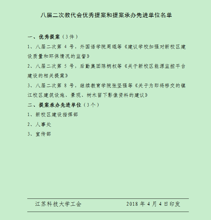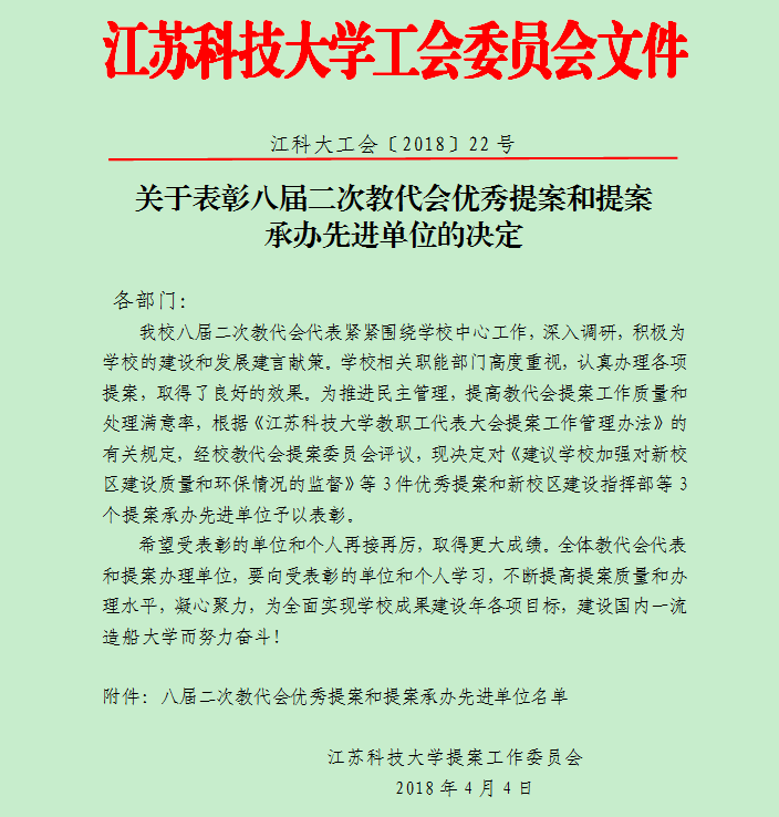 关于表彰八届二次教代会优秀提案和提案承办先进单位的决定